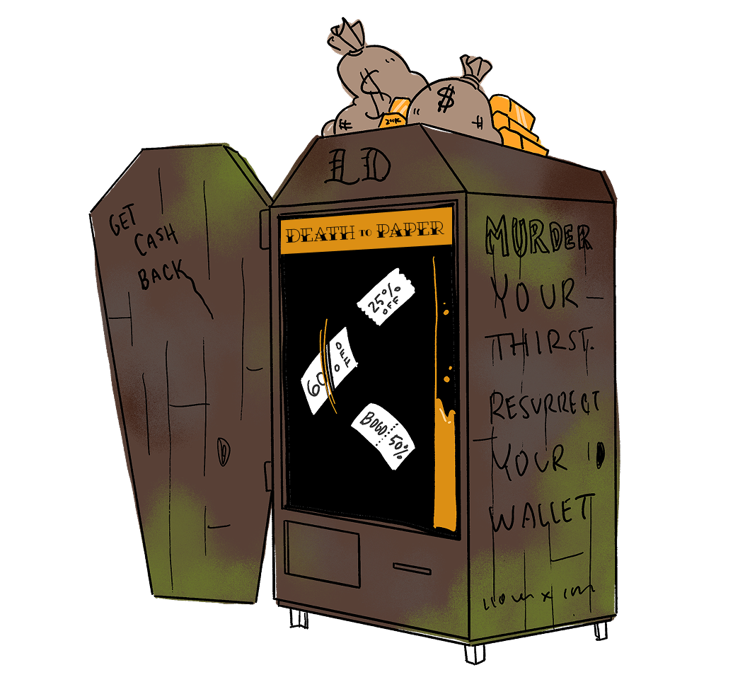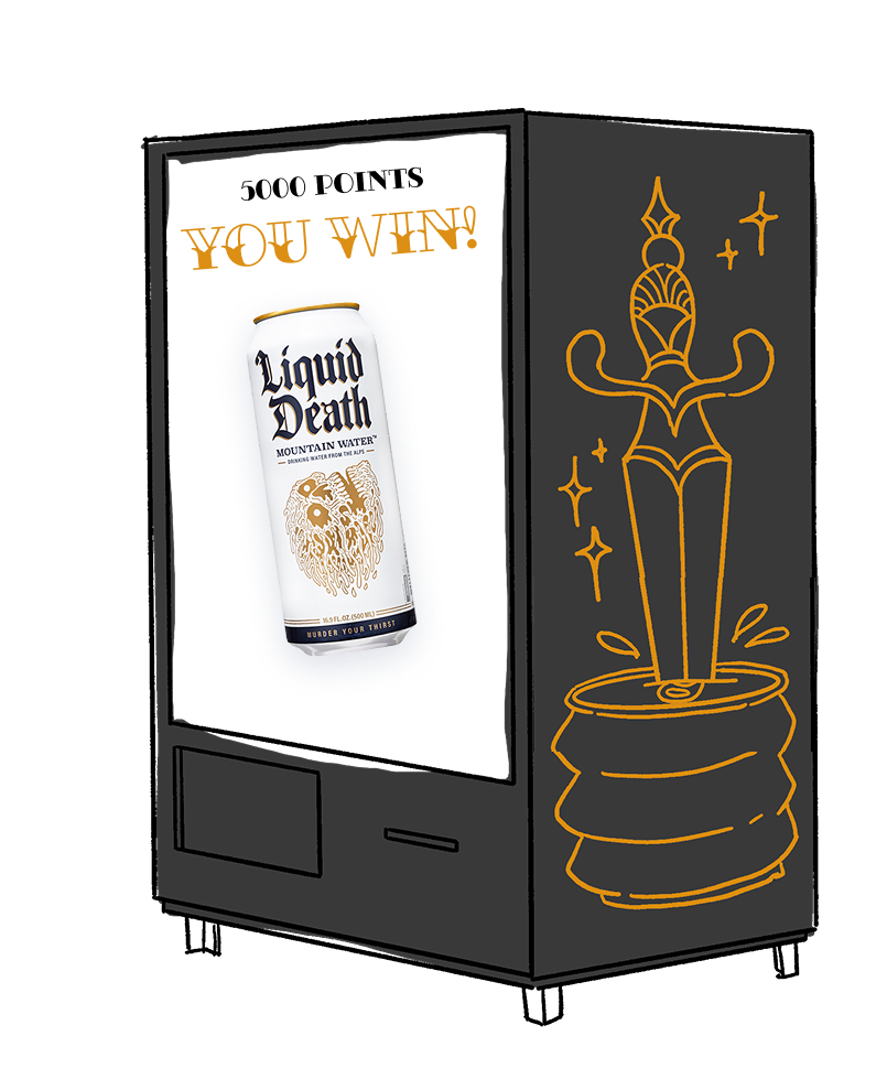 Death to Paper Coupons Digital Game Vending Machine & Hangover Cure Prizes (Liquid Death)