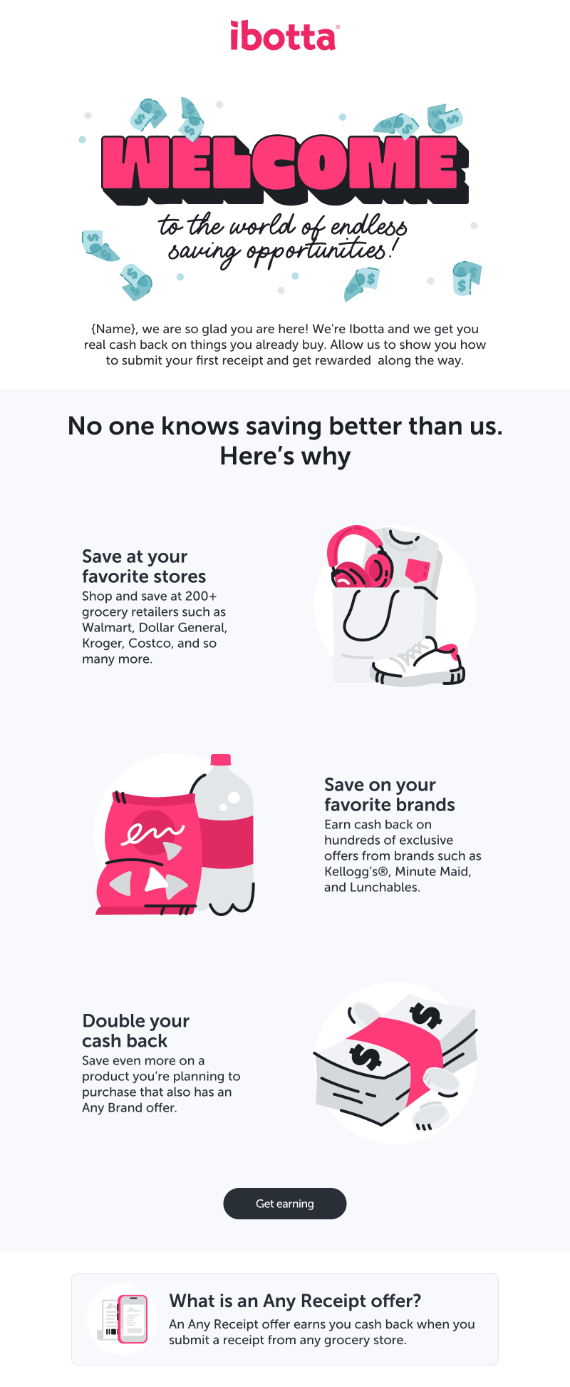 In 2024, I lead our team in the complete overhaul and redesign of all D2C icons and illustrations. In addition to concepting and collaborating with our Creative Director to determine the new look & feel, I created the entire library—over 150 spot icons and nearly two dozen hero illustrations—building Ibotta’s first bespoke illustration collection to be used across the app, web, and all consumer-facing platforms.