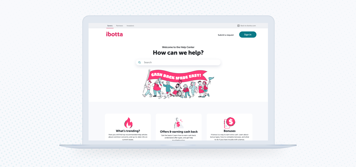 Inside-out refresh: Design a clean and easy-to-navigate home page as well as internal articles so our Savers have a smooth UI experience. Savers should feel welcomed, particularly since they’re likely already visiting the Help Center because they’re having technical issues, and should instantly feel like they are still navigating an Ibotta-branded site.